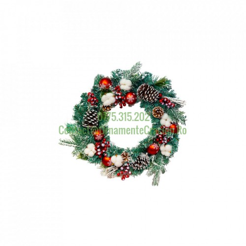 Detalii SKU Descriere Coronita din brad artificial cu decoratiuni rosi si zapada artificiala Diametru: 50 cm * Imaginile, culorile..