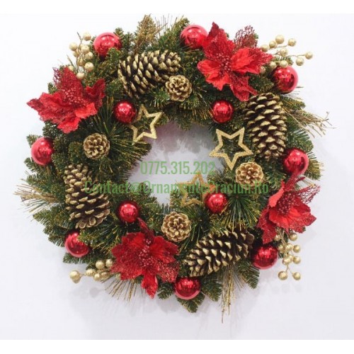 Coronita din brad artificial cu decoratiuni rosi, flori, globulete, stelute si merisoare auri, conuri de brad