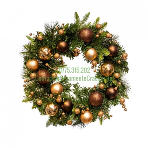 Detalii SKU Descriere Coronita din brad artificial cu decoratiuni auri,flori, stelute, globulete si conuri de brad Diametru: 80 c..