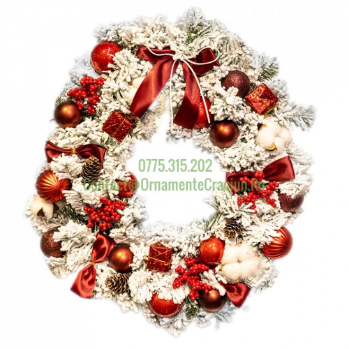 Detalii SKU Descriere Coronita din brad artificial cu decoratiuni rosi si zapada artificiala Diametru: 80 cm * Imagi..