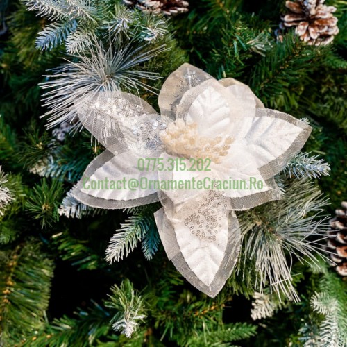 Decoratiune pentru brad in forma de floare, culoare alb, dimensiune 26 cm, MI-1071