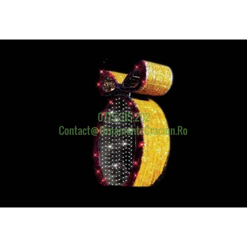 - Material și structură: Schelet realizat din țeavă pătrată și bare de aluminiu, prevăzut cu tub luminos alb și șiruri luminoase albe și roșii. Peste schelet se adaugă carpete și beteală aurie și roșie pentru un efect vizual spectaculos.